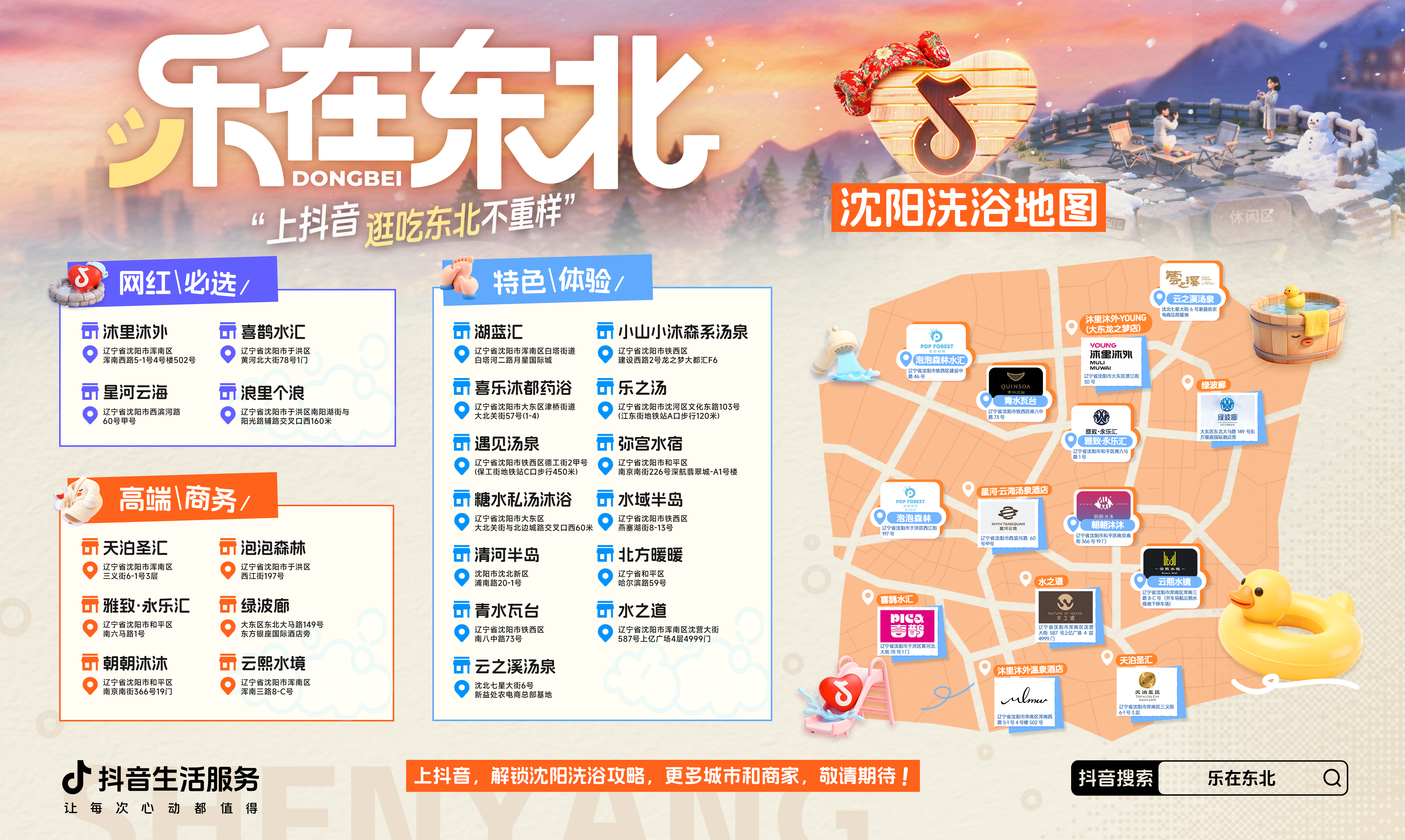 值此时节,抖音生活服务北方区域正式启动“乐在东北”冬季企划,聚焦哈尔滨、长春、沈阳、大连四大城市,以“冰雪+洗浴”双重特色,开启北方消费的冬日新篇。
